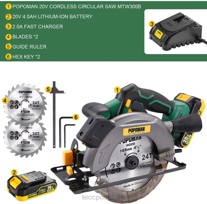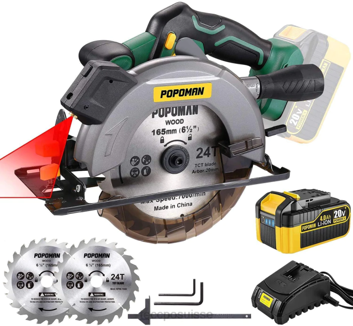 - (paquet et promesse de qualité) – la boîtecomprend : 1 x scie circulaire sans fil ; 1 batterie lithium-ion 20 V 4,0 Ah ; chargeur rapide d’une heure ; 2 lames à pointe en carbure de 24 dents (6-1/2″) ; 1 x guide parallèle ; 1 x clé Allen et 1 x manuel d’utilisation. Popoman offre une promesse de qualité de satisfaction de 2 ans. Si vous avez des questions, nous serons toujours là pour vous aider.