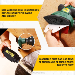 - (économique ) le sac à poussière en pur coton est lavable et recyclable par rapport à la plupart des poubelles, qui ont également une ouverture extra large pour une élimination plus rapide. la ponceuse est livrée avec 12 papiers de verre (6 morceaux de grain 80 et 6 morceaux de grain 180) pour durer la ponceuseune longue durée de vie et répond à vos différentes applications.