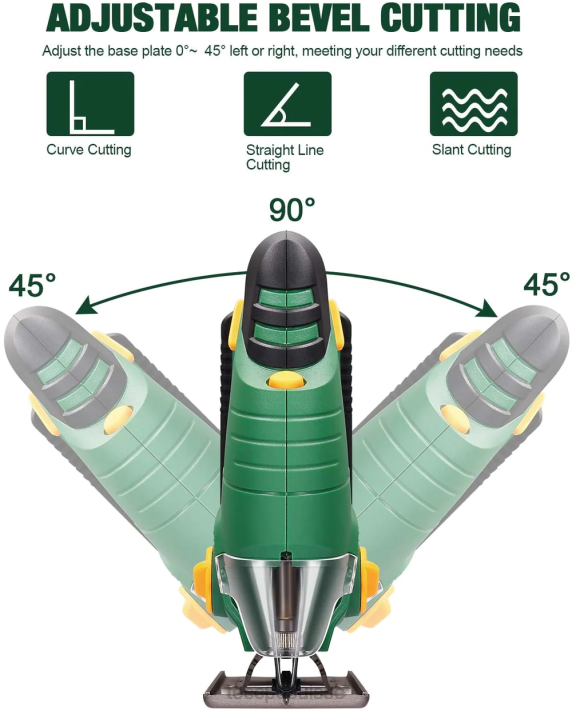 - ( Coupe en biseau à 45 degrés et changement de lame sans outil) La plaque de base réglable permet à la scie sauteuse de biseauter jusqu’à 45 degrés à droite et à gauche. à gauche, adapté à une utilisation multifonction. La pince de lame sans outil permet un changement de lame facile et sûr en 2 secondes. deux lames seront livrées séparément avec la scie pour la coupe du bois et la coupe du métal mou, répondant à différents besoins de coupe.