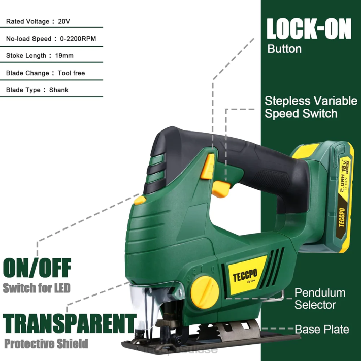 - (batterie remplaçable) la batterie de cette scie sauteuse sans fil est compatible avec toutes les batteries teccpo et popoman.