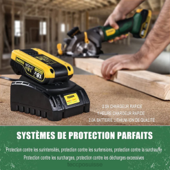 (batterie 18 V et chargeur rapide 2 A) haute mobilité, brisant les limites des scies circulaires traditionnelles ; Batterie 2,0 Ah et chargeur rapide 2 A avec une charge complète en 1 heure ; scies circulaires sans fil avec une excellente maniabilité et portabilité, idéales pour les personnesceux qui travaillent en déplacement