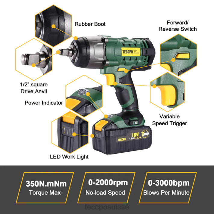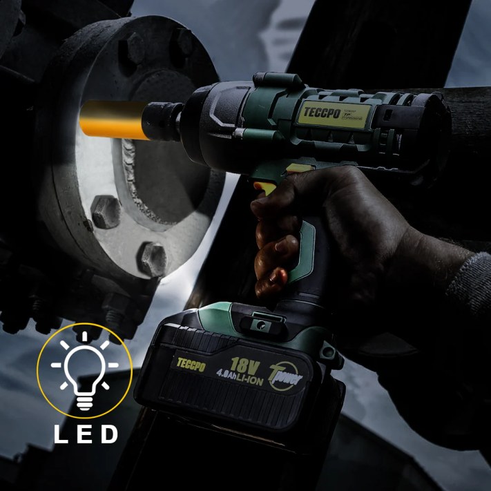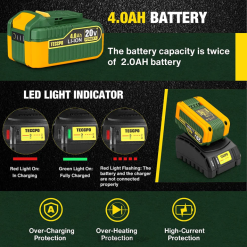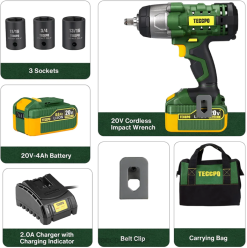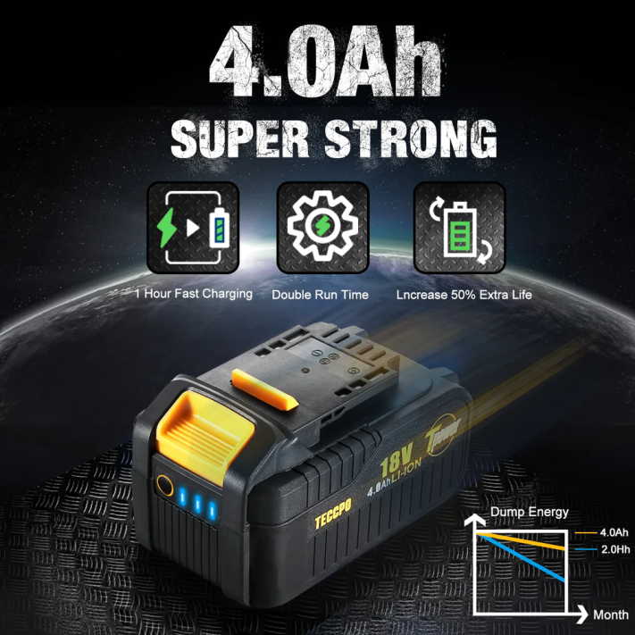 (Batterie de 4 000 mAh et chargeur rapide) La batterie de 4 000 mAh offre plus de travail par charge (compatible avec tous les produits de la série Teccpo 18 V). ; Le chargeur rapide de 4,0 Ah ne prend que 1 heure pour une charge complète et maintient la clé électrique en fonctionnement constant, un excellent système de gestion de la température maintient la batterie au frais.