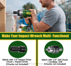 - ( Mandrin 1/2″ + fonction 3 en 1 comme clé à chocs/visseuse/perceuse) Le mandrin de 1/2″ avec anneau de porc est une idée pour un changement de douille sans outil ; correspond avecMandrin de perçage 1/2″ (non inclus), vous pouvez facilement convertir votre clé à chocs en perceuse pour effectuer des fonctions de perçage, en particulier pour les tâches de perçage qui ne nécessitent pas une grande précision ; et correspondre avec un mandrin de tournevis à percussion 1/2″ (non inclus). incluse), votre clé à chocs peut être utilisée comme visseuse à chocs. pas besoin de dépenser de l’argent dans plusieurs outils !