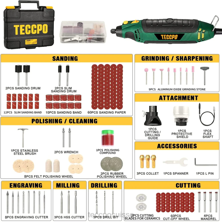 - [ contenu de l’emballage] – 1 x outil multifonction teccpo 200w, 1 x rail fixe, 1 x support extensible, 1 x arbre flexible, 1 x mandrin à 3 mors, 1 x plaque de protection transparente, 120 1 x accessoires, 1 x étui à accessoires transparent, 1 x boîte à outils, 1 x manuel d’utilisation, 1 x carte d’année de promesse de qualité. teccpo offre une promesse de qualité de 2 ans pour ses produits. veuillez nous contacter si vous rencontrez des questions/préoccupations concernant quoi que ce soit.