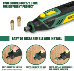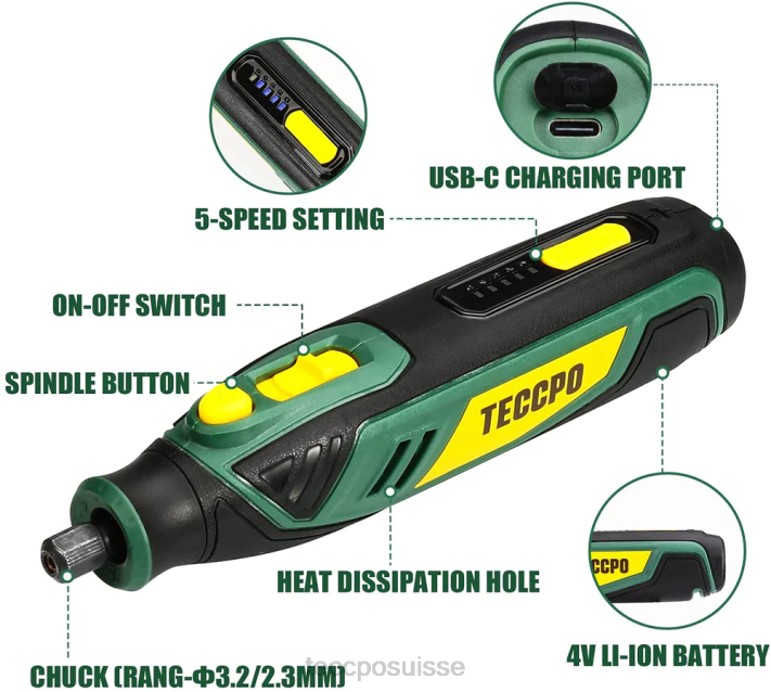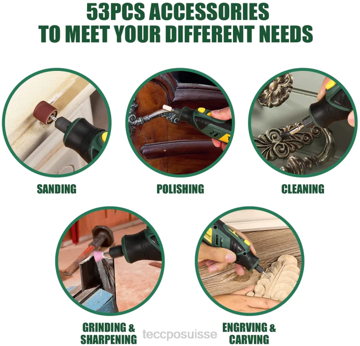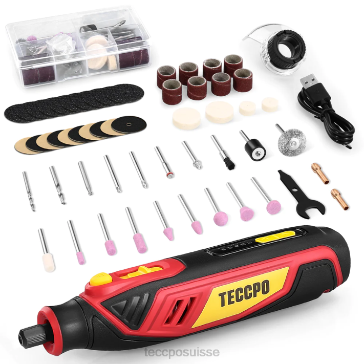- [meilleur choix] – L’outil rotatif teccpo est la solution incontournable du bricoleur pour les petits travaux de rénovation domiciliaire et les projets d’artisanat. le kit d’outils rotatifs est livré avec : 1 outil rotatif 4 V, 53 accessoires avec roue de polissage en laine, brosse à poils et coupe HSS. 1 x câble USB-C, 1 x protection, 1 x manuel d’utilisation.