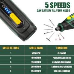 - [5 vitesses variables] – ajustez en toute transparence de 5 000 à 25 000 à la vitesse idéale pour un contrôle et une maniabilité optimaux. Les options à 5 vitesses peuvent être adaptées avec précision à différentes situations, ce qui vous permet de contrôler facilement les gravures fines sur le bois, le verre, le métal, le plastique, le carrelage et bien plus encore. l’outil rotatif sans fil est équipé d’un excellent moteur 4 V, qui fournit une puissance puissante et stable.