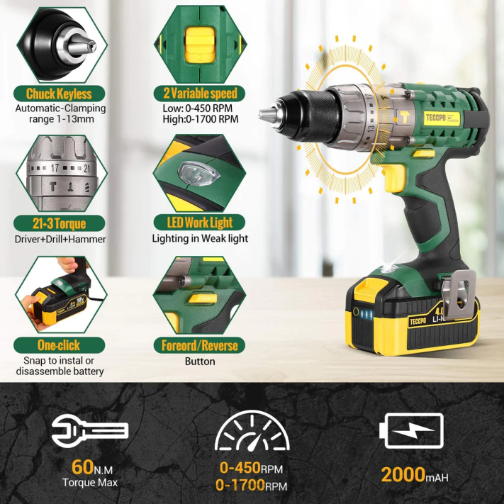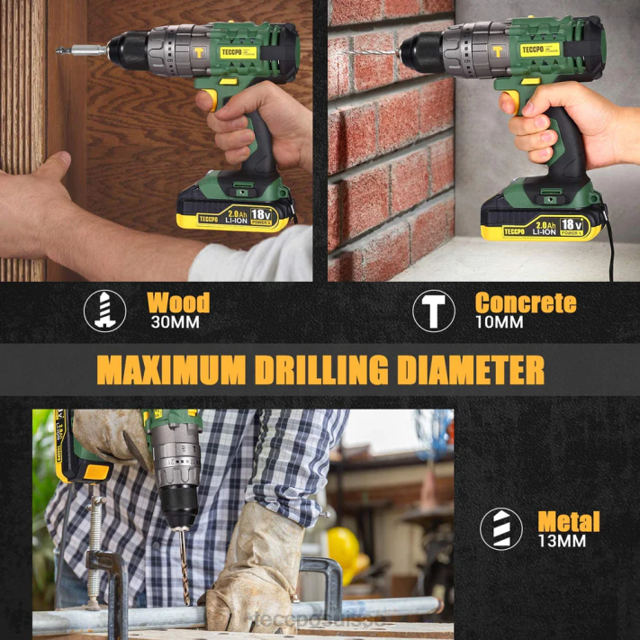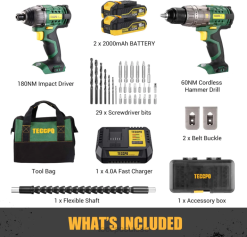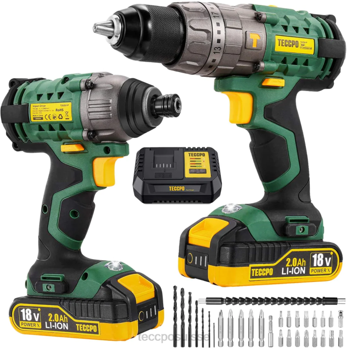 - jeu de 2 perceuses 18 v. Kit perceuse sans fil et clé à chocs teccpo. comprend : 2 batteries, 1 chargeur, 1 étui et de nombreux accessoires utiles pour des fonctions plus puissantes.