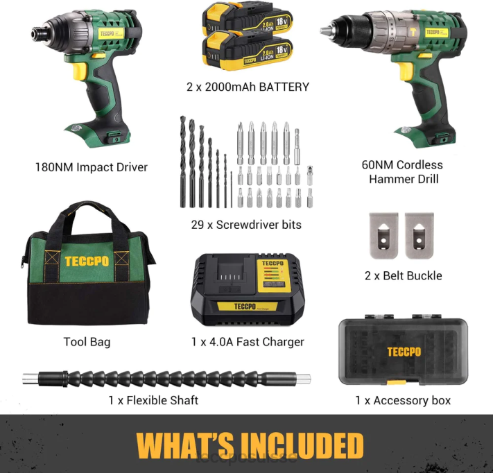 - 35 accessoires inclus : 1 x perceuse sans fil teccpo 18 V, 1 x clé à chocs sans fil teccpo 180 nm, 1 x rallonge (60 mm), 5 x embouts de tournevis (50 mm), 15 x embouts de tournevis, 1 x adaptateur d’écrou, 7 x forets (uniquement pour percer le métal), 1 x tige flexible, 2 x piles, 1 x 30 minutes chargeur rapide, 2 x boucles de ceinture, 1 x manuel d’utilisation [français non garanti]. batterie de remplacement 4,0 ah – tdbp04p.