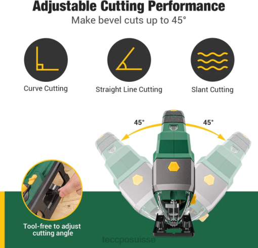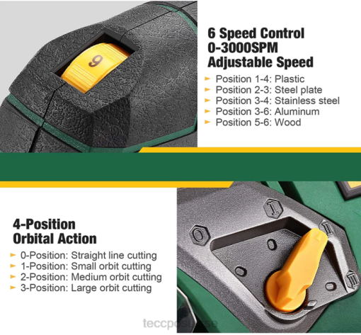 - (vitesse et angle réglables) La molette de vitesse alternative à 6 niveaux permet un contrôle variable de la vitesse de coupe selon vos besoins. L’action pendulaire en 4 étapes crée une attaque puissante pour différents matériaux. Les angles de coupe en biseau vont de 0 degrés à 45 degrés à droite ou à gauche, la plus grande capacité est de 2 3/4″ pour le bois et le PVC ; 1/4 “pour le métal.