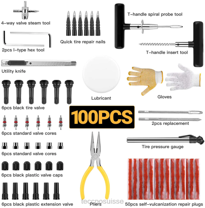 - 100 pièces et conception permettant d’économiser du travail – contenant les 100 pièces élaborées, cet outil thtc04h peut répondre totalement à tous vos besoins en matière de travaux de réparation de pneus. Le kit de réparation de pneus est strictement conforme aux normes de production les plus élevées et au concept de conception scientifique pour vous permettre d’économiser du temps, des soucis et des efforts.